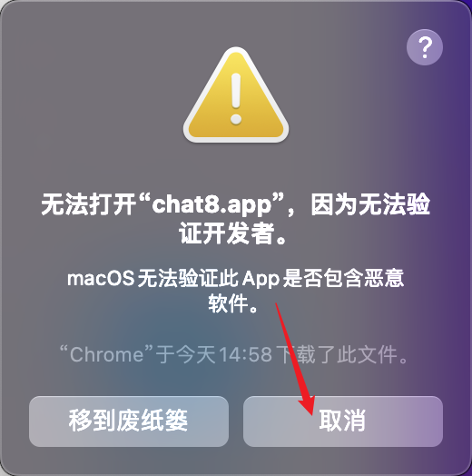 第二步:“提示无法打开‘chat8.app’”,点击取消