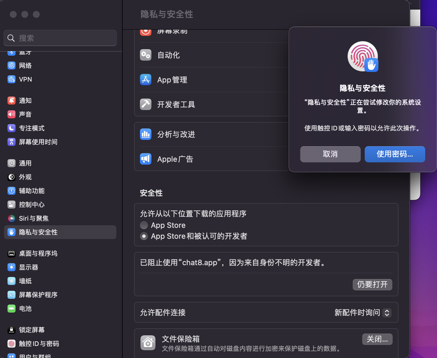 第四步:找到“隐私与安全性”设置,下拉找到‘已阻止使用“chat8.app’,因为来自不明的开发者。”,点击“仍要打开”